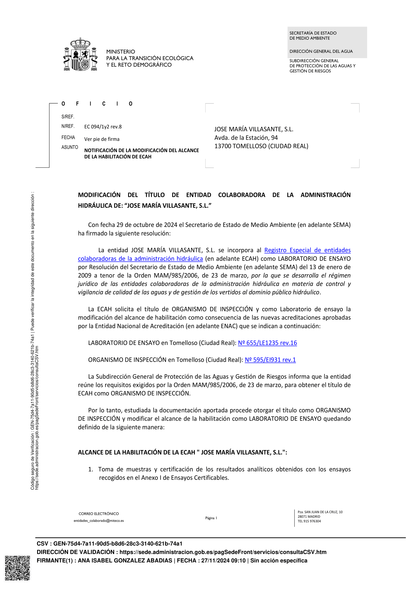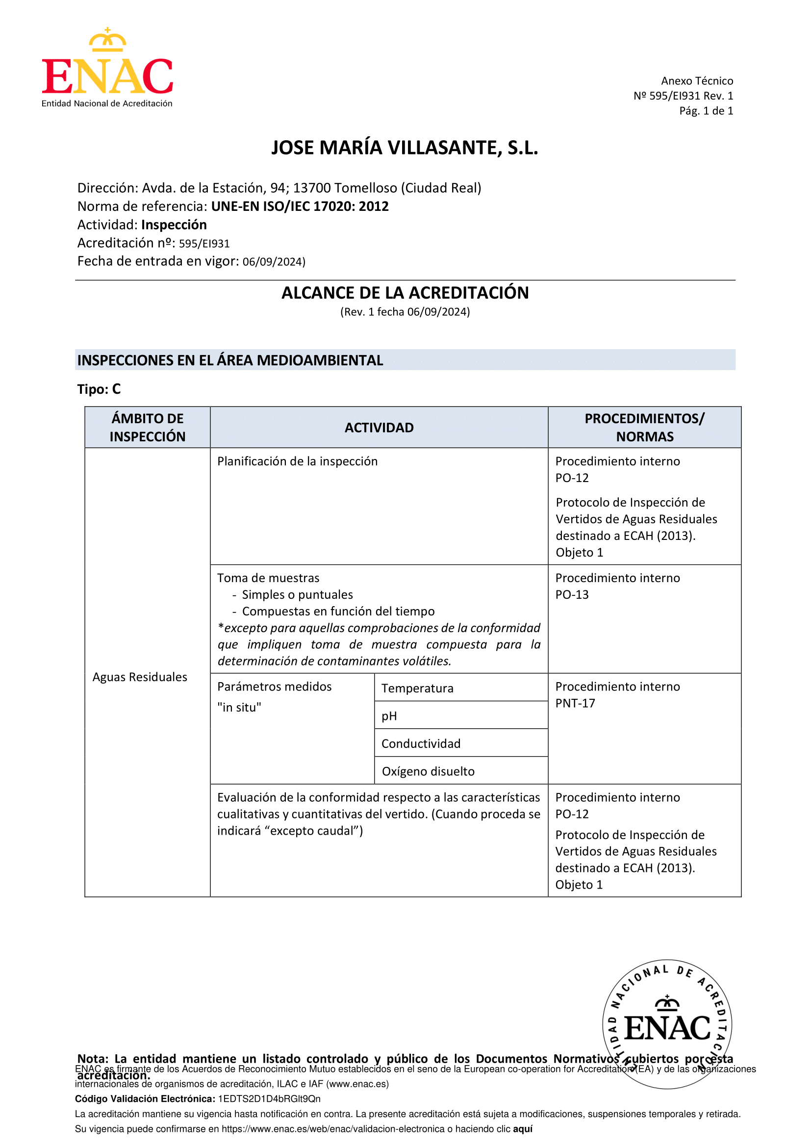 Además es reconocido por el Ministerio de Medio Ambiente como entidad colaboradora de la administración hidráulica como Laboratorio de Ensayo conforme a la Orden MAM/985/200 y está acreditado como Entidad de Inspección por ENAC según la norma 17020.