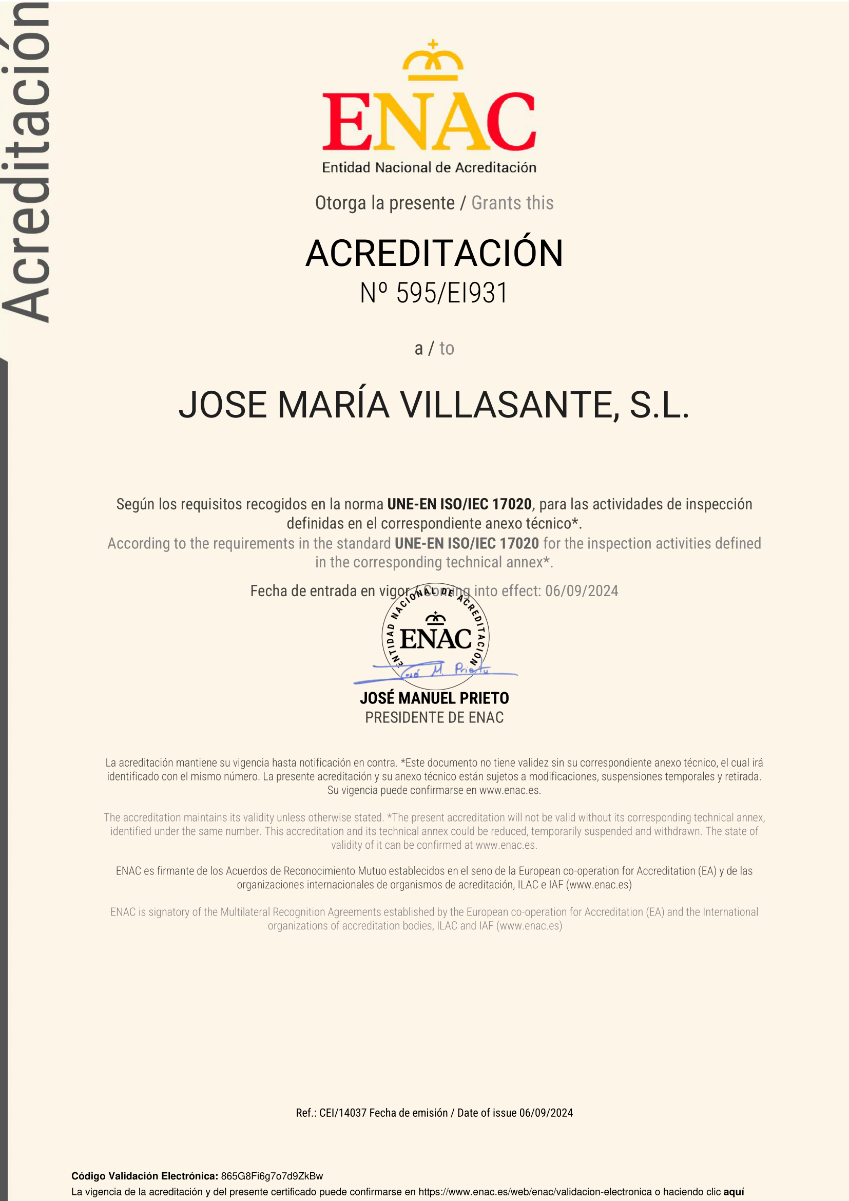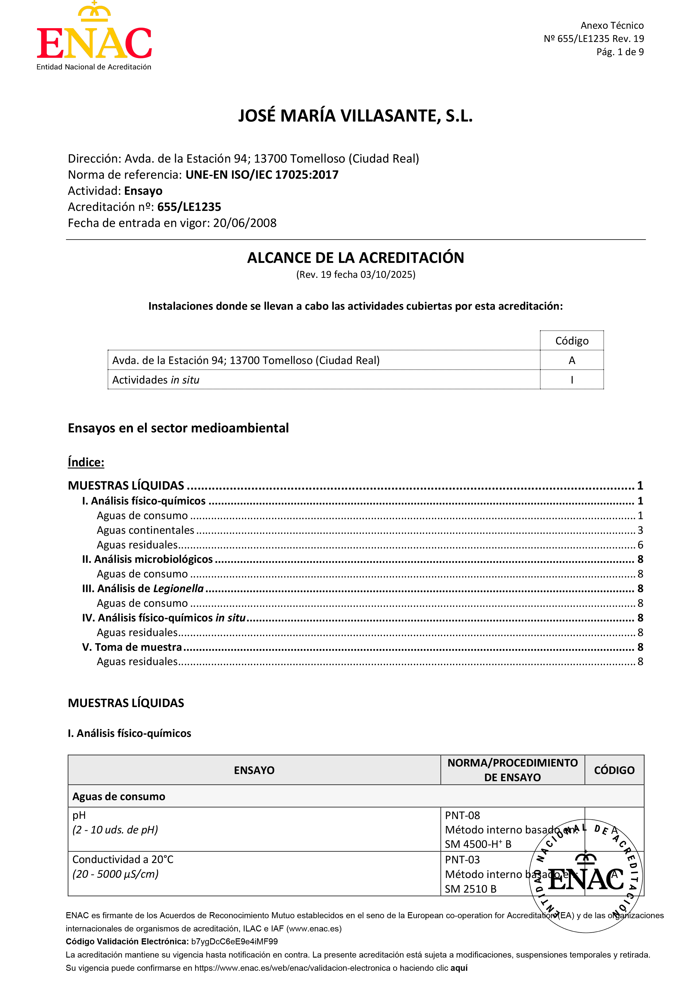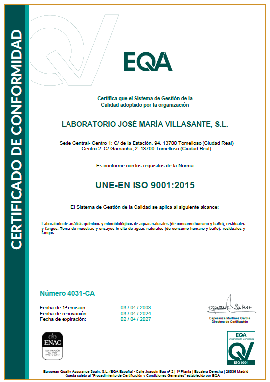 El laboratorio JOSÉ MARIA VILLASANTE S.L. tiene implantado un Sistema de Gestión de la Calidad. Está acreditado por ENAC bajo la norma ISO 17025, y certificado según la norma ISO 9001.